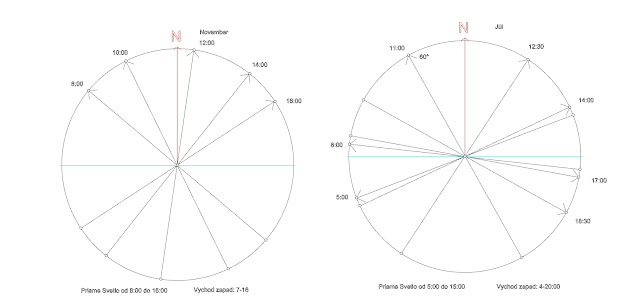 Pomocou tieňa ktorý vrhá červená šípka som mapoval, pod akým uhlom na oblasť dopadajú slnečné lúče.